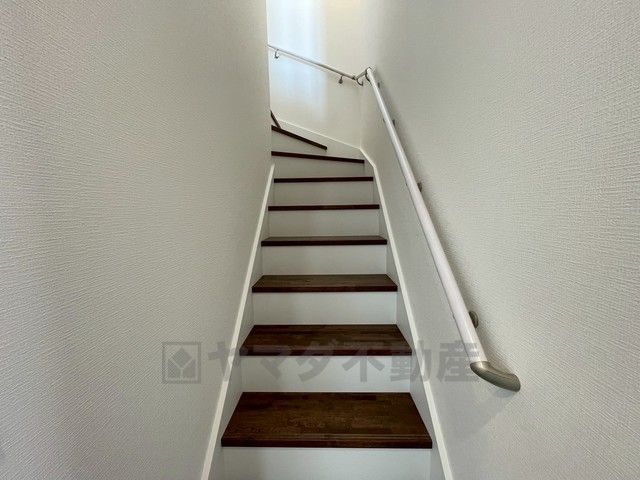 ご年配の方でも安心できる、手すり付き階段です^^段差も低めで設定されてますので安全性にも優れてますね^^