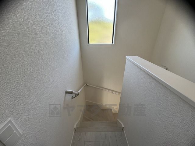 ご年配の方でも安心できる、手すり付き階段です^^段差も低めで設定されてますので安全性にも優れてますね^^