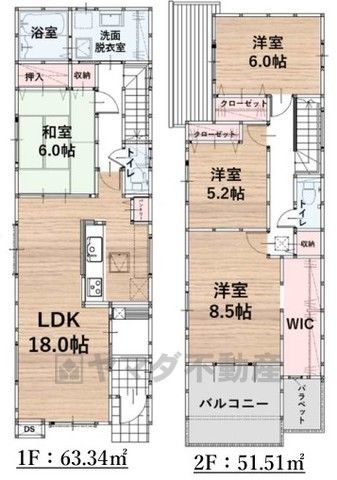LDK18畳(1F)、和6畳(1F)、洋8.5畳(2F)、洋6畳(2F)、洋5.2畳(2F) |