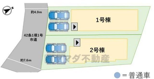 2号棟。カースペースは並列2台分。 前面道路は、南西側4.9~7.6m。