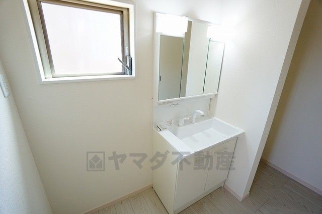 同仕様写真。三面鏡つき洗面台。収納も一体型になっているので、ドライヤーやヘアアイロンの置き場に困りませんね。
