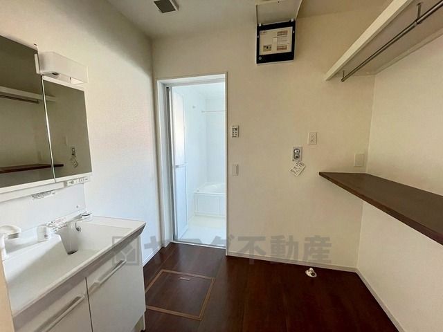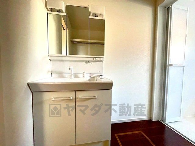 同仕様写真。三面鏡つき洗面台。収納も一体型になっているので、ドライヤーやヘアアイロンの置き場に困りませんね。