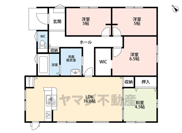 LDK16.6畳(1F)、和4.5畳(1F)、洋6.5畳(1F)、洋5畳(1F) |