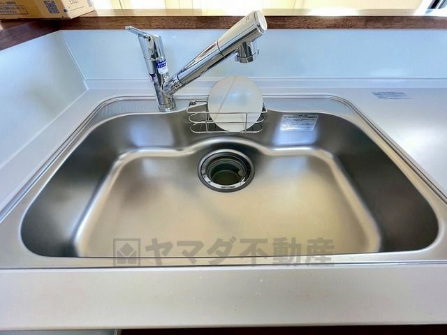 同仕様写真。広々とした凸型シンクに洗剤ポケットを標準装備。大きなお鍋など洗いやすいです。洗剤や石鹸、スポンジもすっきりできる収納付き。
