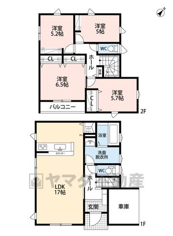 LDK17畳(1F)、洋6.5畳(2F)、洋5.7畳(2F)、洋5.2畳(2F)、和5畳(2F) |