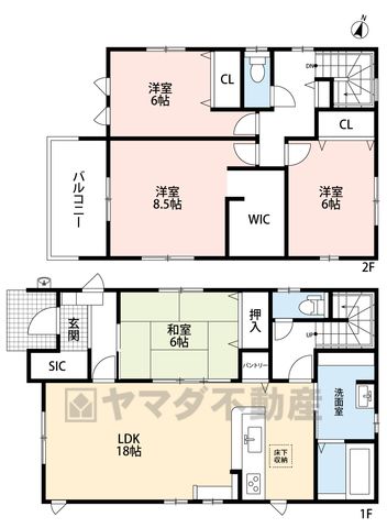 LDK18畳(1F)、和6畳(1F)、洋8.5畳(2F)、洋6畳(2F)、洋6畳(2F) |
