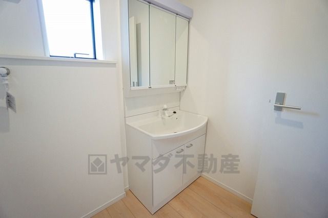 三面鏡つき洗面台。収納も一体型になっているので、ドライヤーやヘアアイロンの置き場に困りませんね。