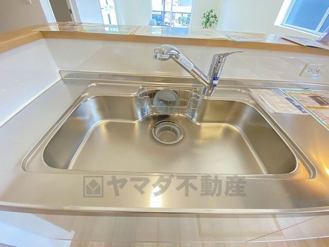 広々とした凸型シンクに洗剤ポケットを標準装備。大きなお鍋など洗いやすいです。洗剤や石鹸、スポンジもすっきりできる収納付き。