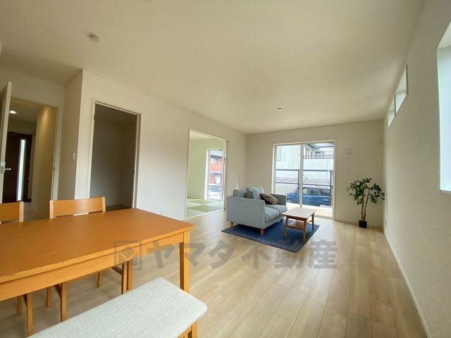 大きな窓のあるリビングは、陽光あふれる明るい空間です。居心地良く、ご家族皆がゆったり寛げる憩いの空間となりそうです。