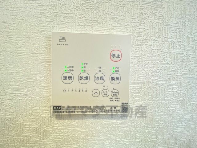 雨の日の洗濯も安心できる浴室暖房乾燥機付き浴室。リモコンで操作もボタン1つで簡単。 浴室暖房乾燥機には、暖房、乾燥、涼風、換気の4つの機能が付いています。タイマー付きです。