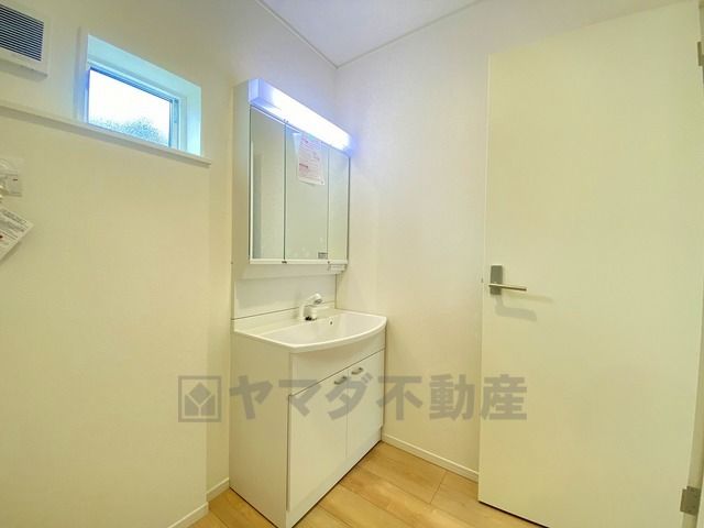 三面鏡つき洗面台。収納も一体型になっているので、ドライヤーやヘアアイロンの置き場に困りませんね。