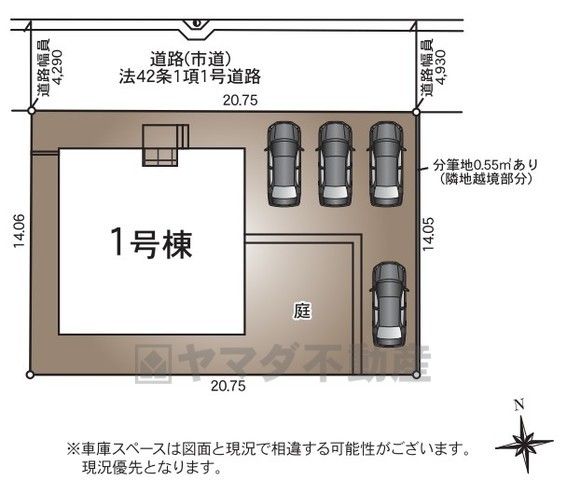 駐車スペースはゆとりある4台分を確保。マイカー用に、お客さま用に、余裕を持ってご利用いただけます。前面道路は公道北側約4.93m。