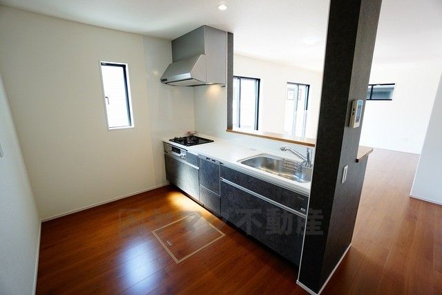 同仕様写真。対面式カウンターキッチンでお子様の様子が見守れます。カウンタートップは耐熱性に優れており、日ごろのお掃除もふき取るだけでOK。ステンレスシンクも簡単にお掃除できますよ。