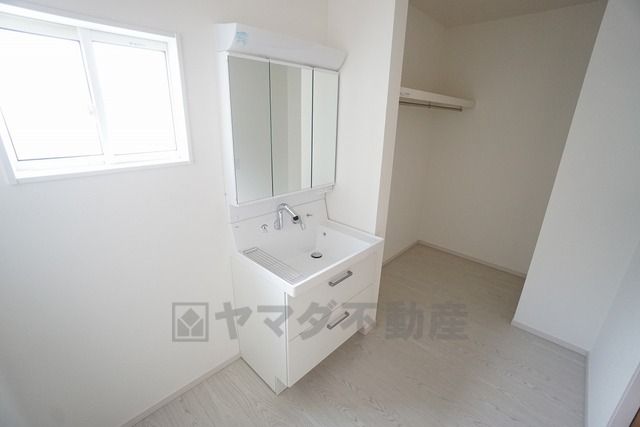 同仕様写真。三面鏡つき洗面台。収納も一体型になっているので、ドライヤーやヘアアイロンの置き場に困りませんね。