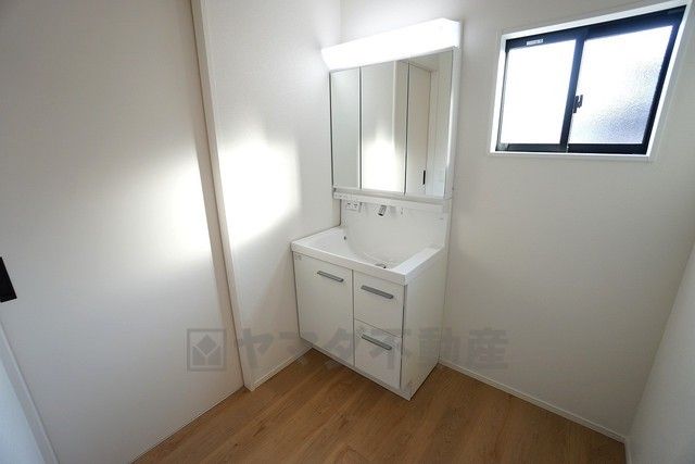 同仕様写真。三面鏡つき洗面台。収納も一体型になっているので、ドライヤーやヘアアイロンの置き場に困りませんね。
