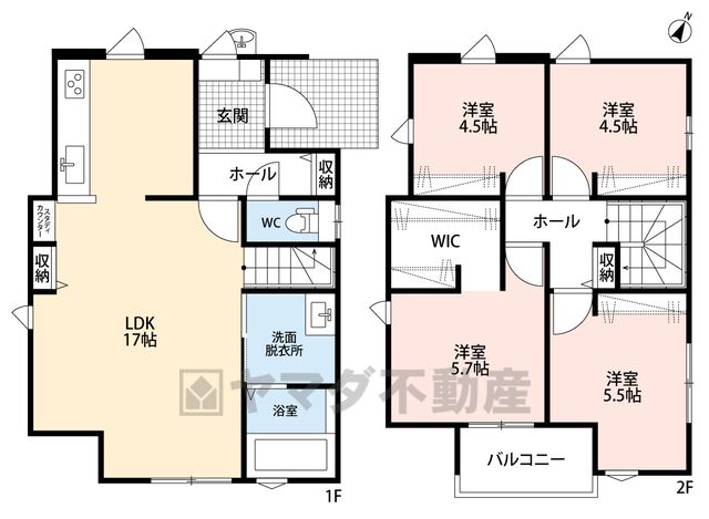 LDK17畳(1F)、洋5.7畳(2F)、洋5.5畳(2F)、洋4.5畳(2F) |