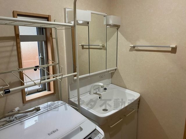 三面鏡つき洗面台。収納も一体型になっているので、ドライヤーやヘアアイロンの置き場に困りませんね。