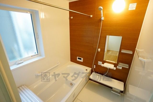 同仕様写真。1日の疲れを癒すくつろぎのバスルーム。足を伸ばしてもゆったりと入れるサイズです。お子様と一緒にお風呂に入っても狭くないですね^^