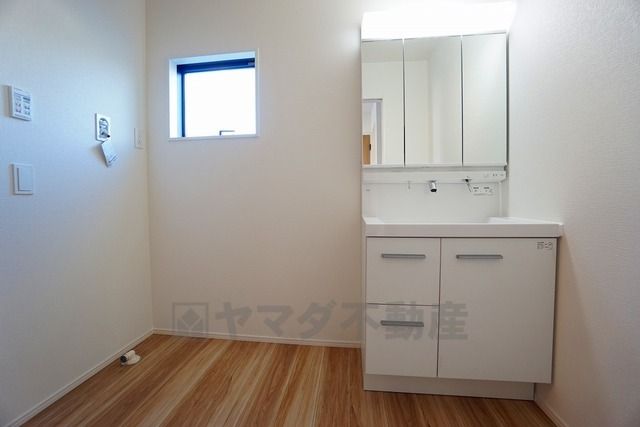 三面鏡つき洗面台。収納も一体型になっているので、ドライヤーやヘアアイロンの置き場に困りませんね。