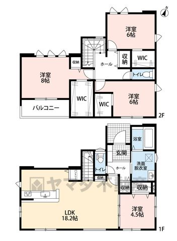 LDK18.2畳(1F)、洋4.5畳(1F)、洋8畳(2F)、洋6畳(2F) |