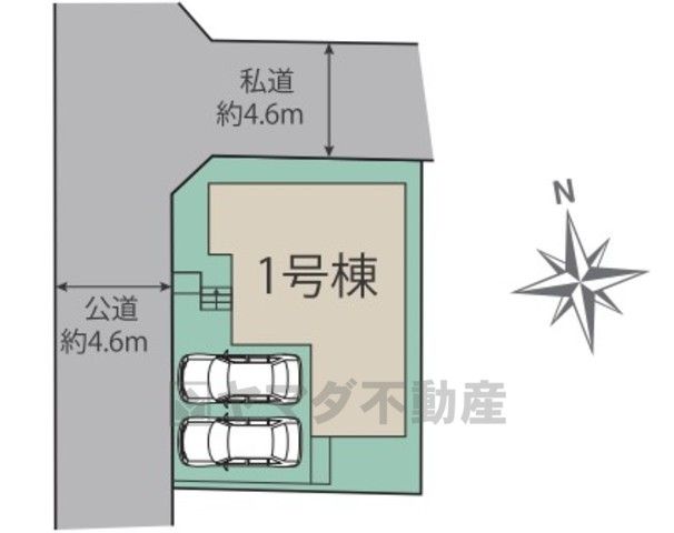 カースペースは並列2台分を確保。前面道路は、公道西側約4.6m、私道北側4.6m。