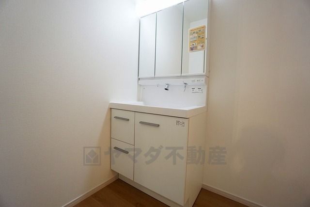 収納が隠れて使いやすい、シャワー付き三面鏡洗面ドレッサーです。朝の準備もぬかりなくできます。