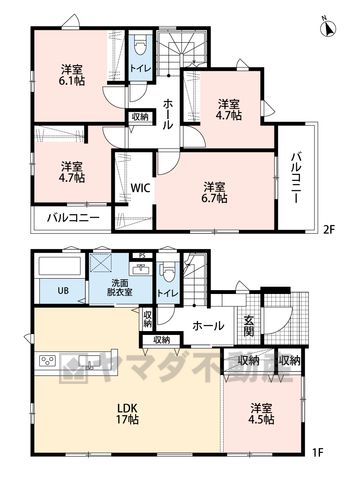 LDK17畳(1F)、洋4.5畳(1F)、洋6.7畳(2F)、洋6.1畳(2F)、洋4.7畳(2F) |