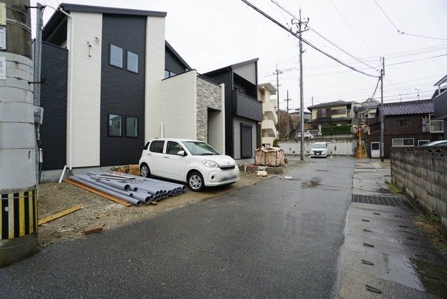 カースペースは2台分を確保^^ 前面道路は、公道北側約7.7m、東側約4.1m、南側約3.5m。 2棟とも角地で日当たり風通し良好^^