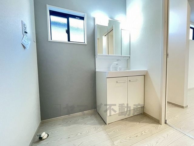 三面鏡つき洗面台。収納も一体型になっているので、ドライヤーやヘアアイロンの置き場に困りませんね。