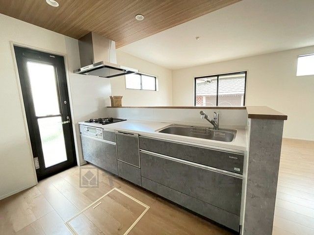 対面式カウンターキッチンでお子様の様子が見守れます。カウンタートップは耐熱性に優れており、日ごろのお掃除もふき取るだけでOK。ステンレスシンクも簡単にお掃除できますよ。