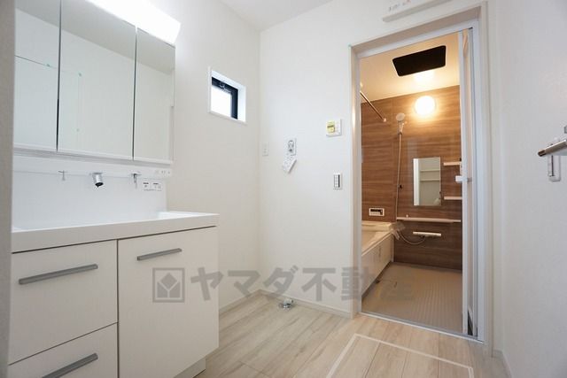 同仕様写真。三面鏡つき洗面台。収納も一体型になっているので、ドライヤーやヘアアイロンの置き場に困りませんね。