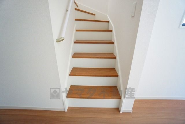 ご年配の方でも安心できる、手すり付き階段です^^段差も低めで設定されてますので安全性にも優れてますね^^