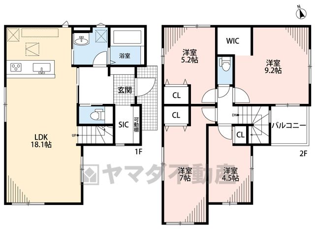 LDK18.1畳(1F)、洋9.2畳(2F)、洋7畳(2F)、洋5.2畳(2F)、洋4.5畳(2F) |