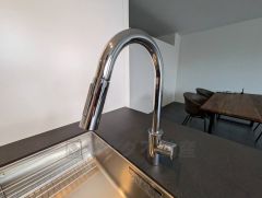 カウンタートップは耐熱性に優れており、日ごろのお掃除もふき取るだけでOK。ステンレスシンクも簡単にお掃除できますよ。
