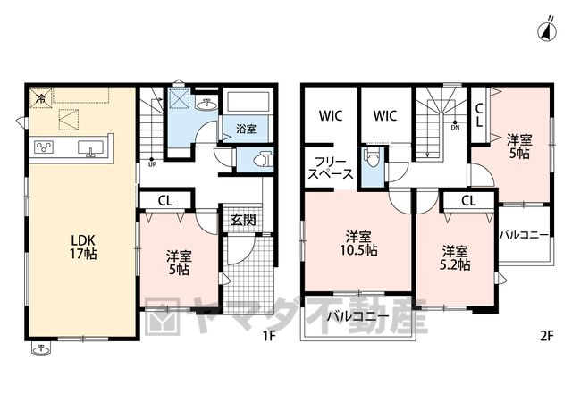 LDK17畳(1F)、洋5畳(1F)、洋10.5畳(2F)、洋5.2畳(2F)、洋5畳(2F) |