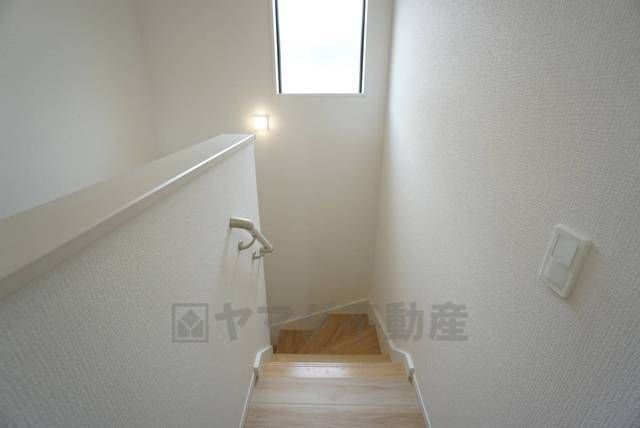 ご年配の方でも安心できる、手すり付き階段です^^段差も低めで設定されてますので安全性にも優れてますね^^