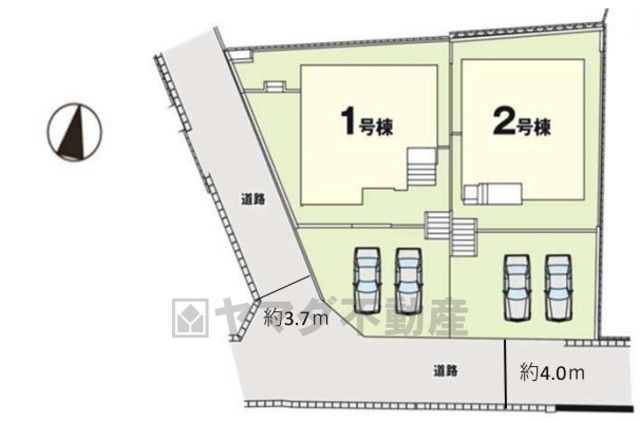 1号棟。前面道路は公道西側約3.7m、南側4m。 カースペースはゆとりある並列2台分を確保^^
