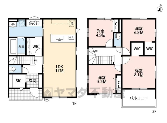 LDK17畳(1F)、洋8.1畳(2F)、洋6.8畳(2F)、洋5.2畳(2F)、洋4.5畳(2F) |