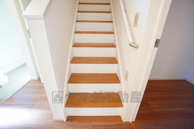 ご年配の方でも安心できる、手すり付き階段です^^段差も低めで設定されてますので安全性にも優れてますね^^