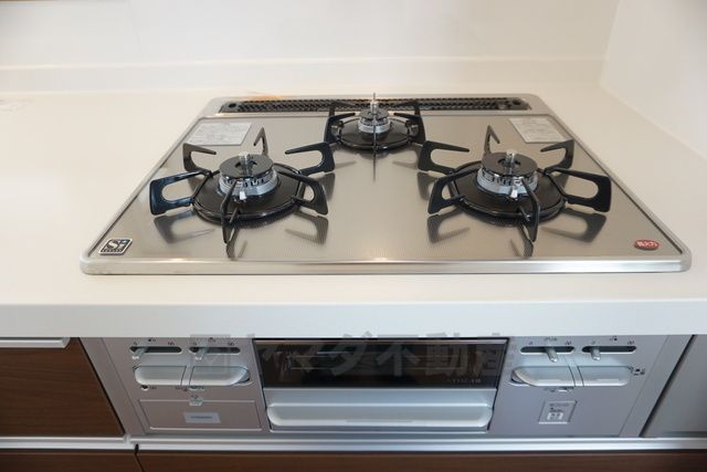 同仕様写真。3種類の料理が同時に調理できる、3口ガスコンロ。忙しい夕食の支度時間が短縮できて嬉しいですね。