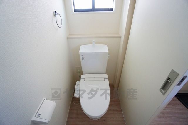 温水洗浄機付トイレです。節水機能もあるので、安心して使えますね。もちろん、1階2階の2ヶ所にトイレがあるので、忙しい朝にもゆとりができますね。