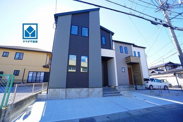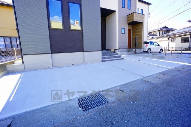1号棟。前面道路は公道北側約5.6m、公道北西側約6.4m。幅広いため駐車や車の離合がスムーズです^^カースペースは2台分を確保^^