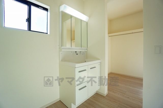 三面鏡つき洗面台。収納も一体型になっているので、ドライヤーやヘアアイロンの置き場に困りませんね。