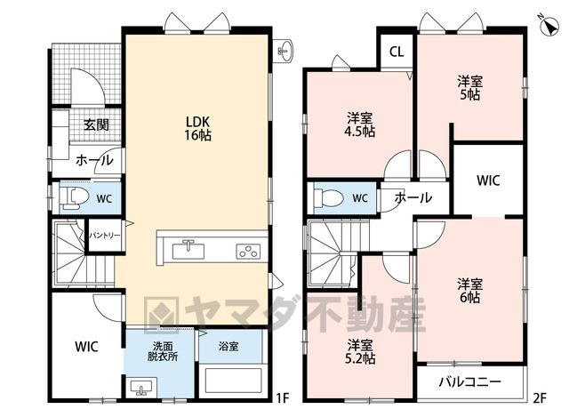 LDK16畳(1F)、洋6畳(2F)、洋5.2畳(2F)、洋5畳(2F)、洋4.5畳(2F) |