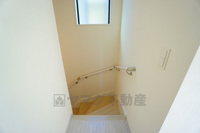 ご年配の方でも安心できる、手すり付き階段です^^段差も低めで設定されてますので安全性にも優れてますね^^