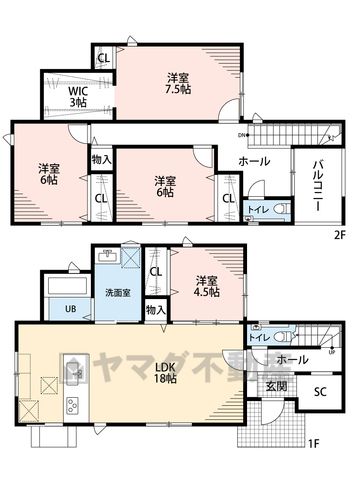 LDK18畳(1F)、洋4.5畳(1F)、洋7.5畳(2F)、洋6畳(2F) |