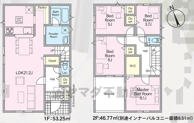 LDK21.2畳(1F)、洋6畳(2F)、洋6.1畳(2F)、洋5畳(2F)、洋3.7畳(2F) |