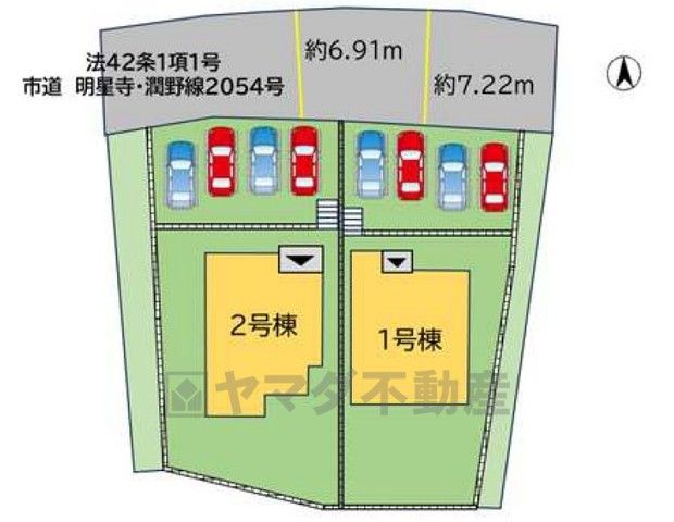 1号棟。カースペースは並列4台分を確保。 前面道路は公道北側約6.91~7.22m。