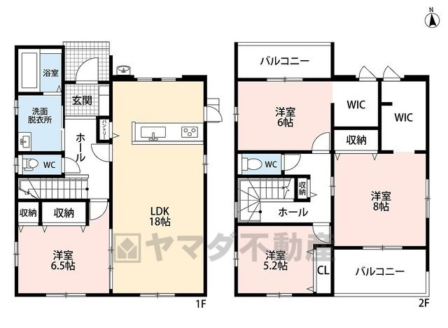 LDK18畳(1F)、洋6.5畳(1F)、洋8畳(2F)、洋6畳(2F)、洋5.2畳(2F) |