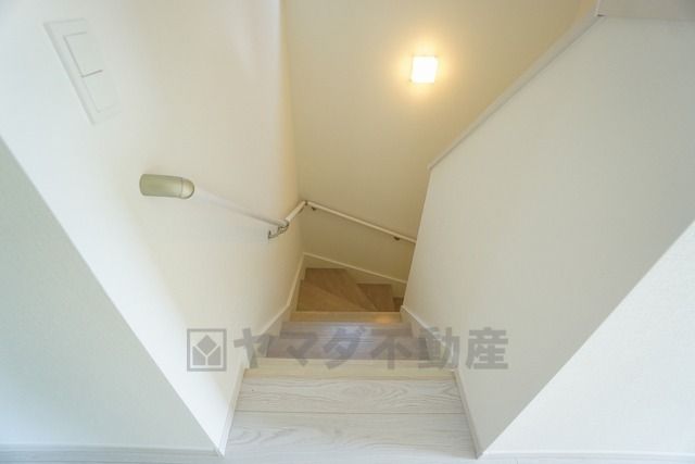 ご年配の方でも安心できる、手すり付き階段です^^段差も低めで設定されてますので安全性にも優れてますね^^